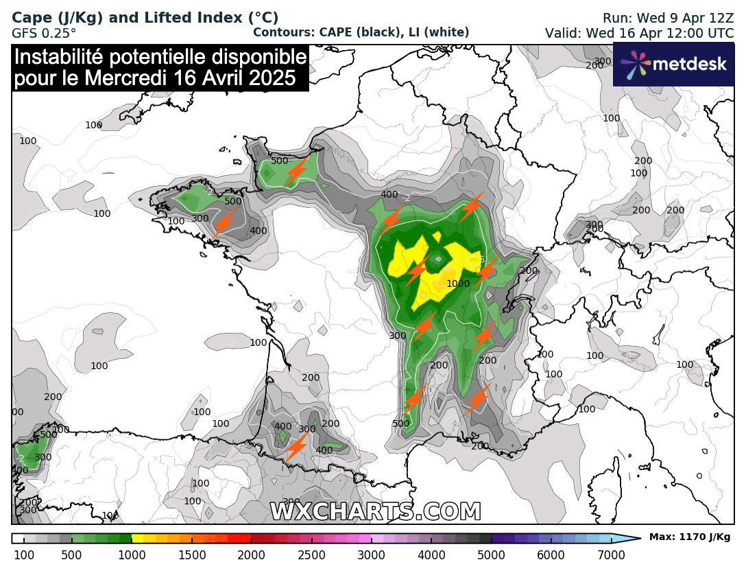 Avec une certaine douceur au sol et un air froid en altitude, le contexte sera également favorable aux orages. Certains paramètres réagissent d'ores et déjà, comme le montre la carte ci-dessous qui correspond à l'instabilité potentielle disponible (carburant des orages) pour le 16 avril prochain. Pour l'heure, il est bien trop tôt pour réaliser une prévision orageuse mais il semble très probable que le tonnerre grondera en de nombreuses régions au passage des averses qui rythmeront la semaine prochaine.