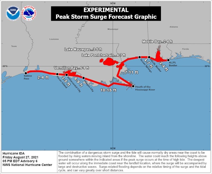Ainsi, grâce à une eau chaude et des cisaillements faibles en altitude, une intensification très rapide était envisagée dans le courant du week-end pour cet ouragan, qui devait atteindre la Louisiane en catégorie 4 en fin de journée de dimanche 29 août 2021.
