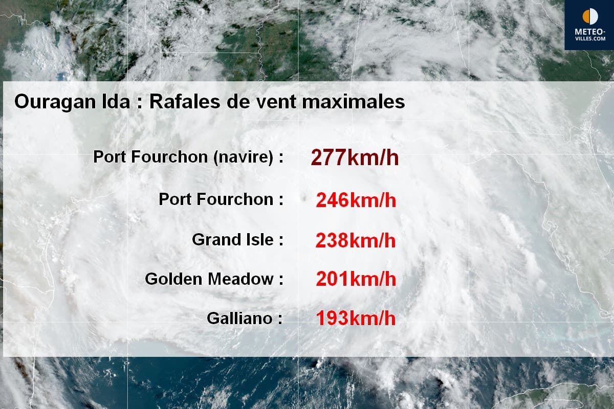 L'ouragan Ida s'est échoué sur les côtes du Sud de la Louisiane peu avant minuit ce dimanche 29 août au niveau de Port Fourchon avec une rafale de 277km/h relevée par une sonde située sur un bateau au Sud de la ville, une valeur exceptionnelle en cours de validation par les services de prévisions météorologiques américains.