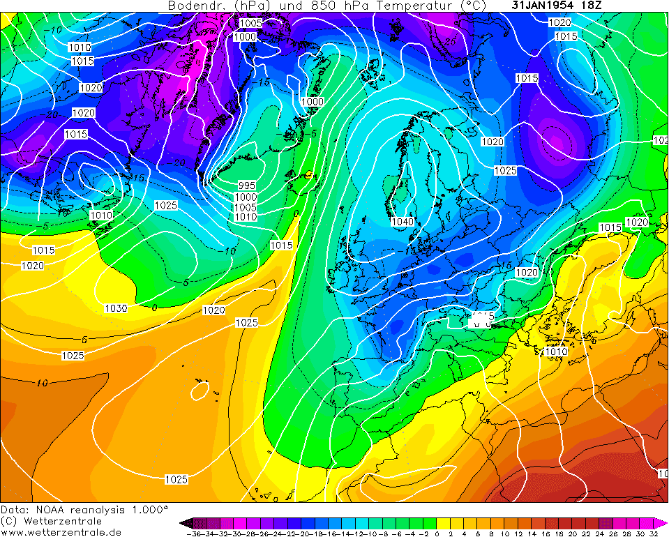 Carte NOAA de la température à 850 hPa, en date du 31 janvier 1954