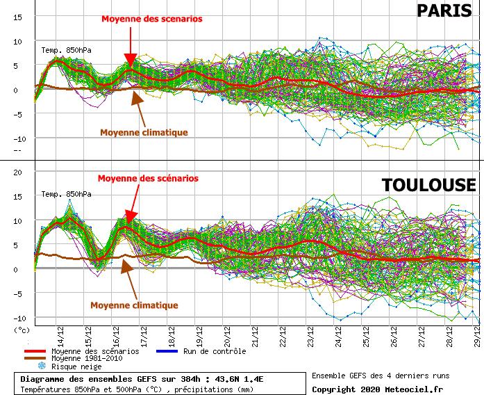 Température de la masse d'air à 1500m d'altitude pour Paris et Toulouse - scénarios GEFS jusqu'au 29 décembre - Météociel