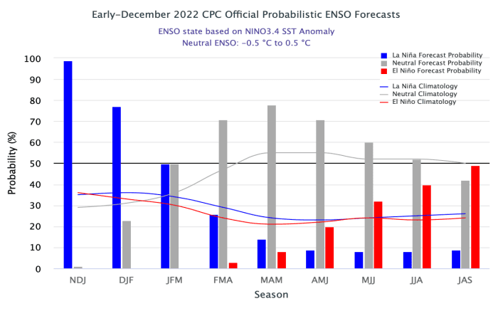 Prévisions des cycles La Niña (en bleu), neutre (en gris) et El Niño (en rouge) jusqu'à l'été 2022 – via NOAA