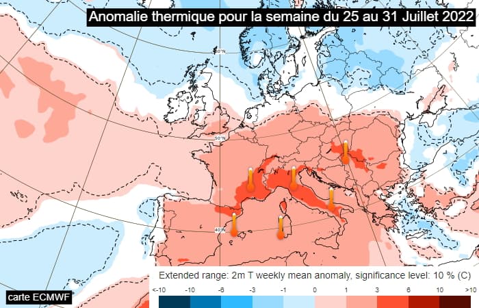 Comme nous l'avons vu ci-dessus, une succession de pulsions chaudes devrait survenir d'ici le début de la semaine prochaine. Si le nord et l'ouest verront les températures fluctuer (tantôt chaudes, tantôt plus respirables), celles du sud-est baigneront en permanence dans l'air chaud. Selon les modélisations pour la semaine prochaine (du 25 au 31 juillet 2022), l'anomalie chaude prononcée devrait se poursuivre sur le quart sud-est de la France.