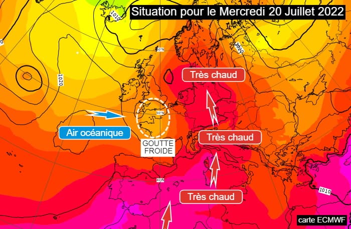 La goutte froide ayant soulevé un air bouillant sur la France en début de semaine survolait le nord-ouest de l'hexagone et la Manche ce mercredi 20 juillet 2022. Celle-ci a généré une infiltration d'air océanique par l'ouest du territoire, conduisant à une baisse très nette des températures par rapport à la veille sur les régions du centre et du nord. Cependant, cette goutte froide est en train de remonter vers la Mer du Nord, si bien que l'air océanique n'atteindra pas véritablement le sud-est de la France.