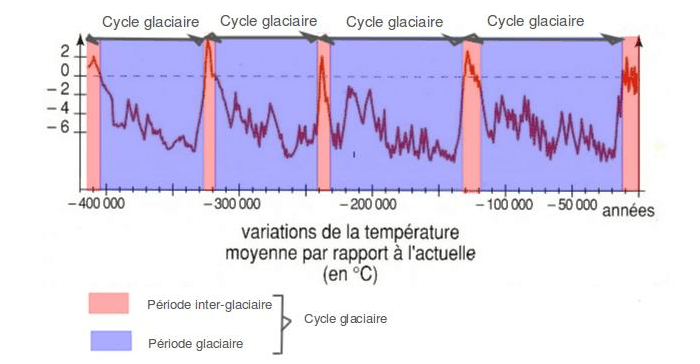 ll est majoritairement admis que ce sont les modifications de l'orbite de la Terre qui génèrent les différents cycles de glaciation et de réchauffement (cycles de Milankovitch). S'en suit un cercle vicieux avec une augmentation ou une diminution nette du CO2, puissant gaz à effet de serre, avec un réchauffement ou un refroidissement du climat mondial. Plus concrètement, on observe sur la gauche du graphique ci-dessous que les températures étaient 9°C en dessous des valeurs actuelles à l'apogée du dernier âge glaciaire, il environ 21.000 ans. Autant dire que le climat n'était absolument pas le même.