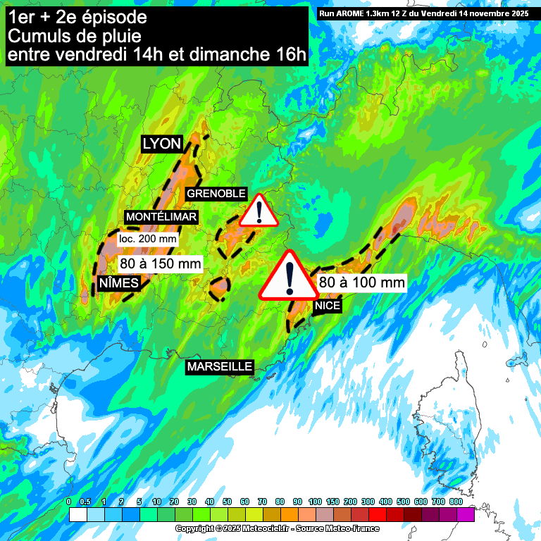 Compte tenu de la lente progression de cette dépression vers nos régions, les précipitations les plus intenses se produiront initialement entre les Cévennes et le Lyonnais, avant de se déplacer vers le sud des Alpes, tout en affectant de nouveau les Cévennes.
