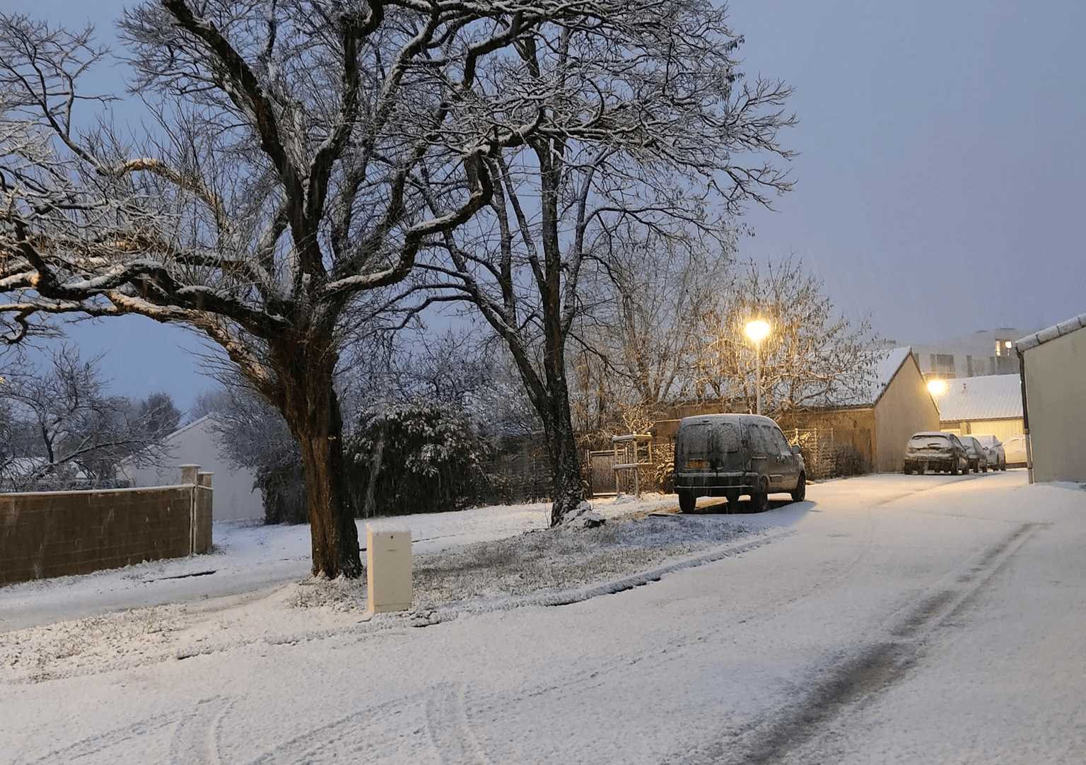 Si l'épisode y est désormais terminé, Charente et Dordogne ont figuré parmi départements les plus touchés avec des accumulations atteignant fréquemment 2 à 4 centimètres. Les intensités furent importantes avec de gros flocons signalés sous des températures comprises entre 0 et +1°C en plaine. Illustration à Périgueux peu avant la tombée de la nuit.