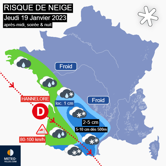 Carte du risque de neige pour l'après-midi et la soirée du jeudi 19 janvier 2023 – Météo Villes