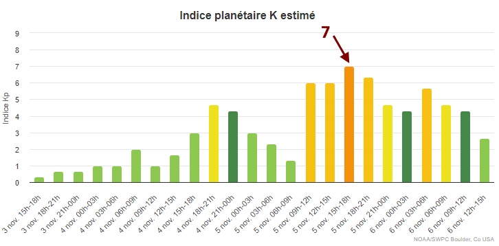 En soirée du dimanche 5 novembre 2023, la Terre a été frappée par un orage magnétique d'intensité notable. L'indice K mesurée par la NOAA permet de jauger l'intensité des tempêtes géomagnétiques. Cet indice débute à 0 et va jusqu'à 9. Il faut qu'il atteigne au moins la valeur 5 pour parler de tempête géomagnétique. Plus d'indice est fort et plus les aurores peuvent être observées à des latitudes basses. Ce dimanche soir, l'indice K a atteint une valeur de 7, un chiffre considérable qui a permis à de nombreux européens d'observer le phénomène. Précisons que cette tempête géomagnétique avait été sous-estimée par les prévisions, qui ne s'attendaient qu'à un événement faible.