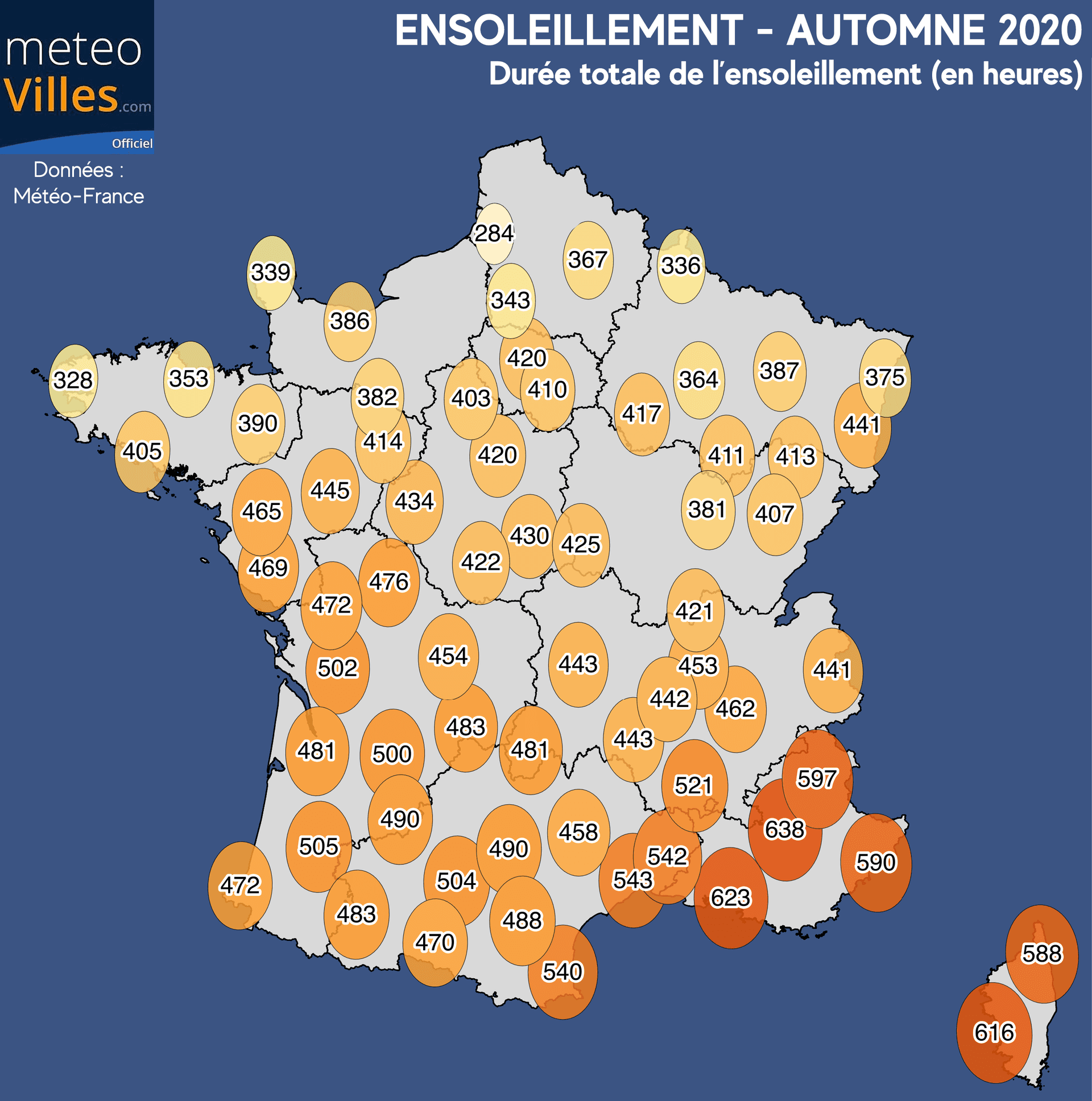 Une fois n’est pas coutume, notons un dégradé d’ensoleillement entre le nord et le sud du pays. Pour les moins privilégiés, il fallait être au nord de la Seine, avec moins de 400 heures de soleil cumulé : 339h à Cherbourg, 336h à Charleville-Mézières, 328h à Brest et même 284h à Abbeville (où une défaillance de sonde est soupçonnée).