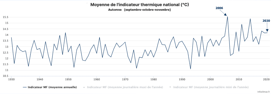 Les mois sous les moyennes de saison deviennent bien rares ces derniers temps. Mais au niveau des saisons, il devient désormais quasi-impossible de passer dans le bleu. Cet automne 2020 l’a encore prouvé : avec une anomalie nationale de +1.0°C (température moyenne de 14.17°C), cet automne se classe au 6e rang des plus chauds depuis le début des relevés, ex-æquo avec l’automne 1949 mais aussi 2019.