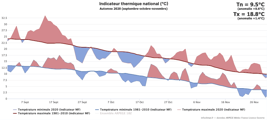 L’hiver calendaire n’est pas encore arrivé (21 décembre), mais d’un point de vue météorologique, ce dernier a débuté depuis le 1er décembre. L’occasion d’effectuer le bilan climatologique de l’ AUTOMNE 2020 (mois de septembre, octobre et novembre) en termes de température, pluviométrie et ensoleillement, sur notre panel de 73 stations métropolitaines*.