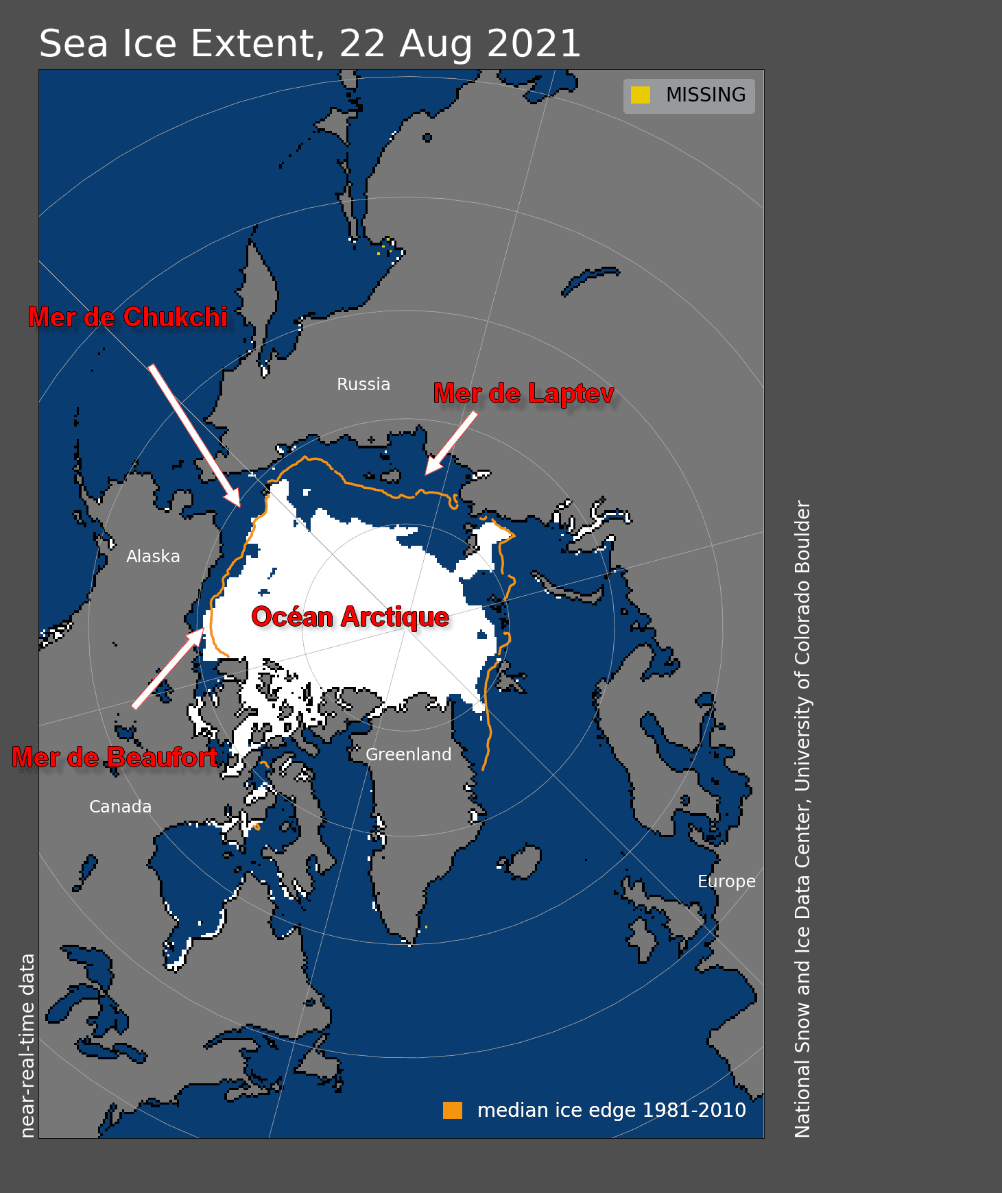 Le déficit se retrouve notamment entre la mer du Groenland, l'océan Arctique, et la mer de Laptev, qui a d'ailleurs enregistré un record bas de superficie glacière depuis le début des relevés. A l'inverse, la superficie de la calotte est plus importante qu'à l'accoutumée sur une large partie Ouest de l'océan Arctique et sur la mer de Beaufort.