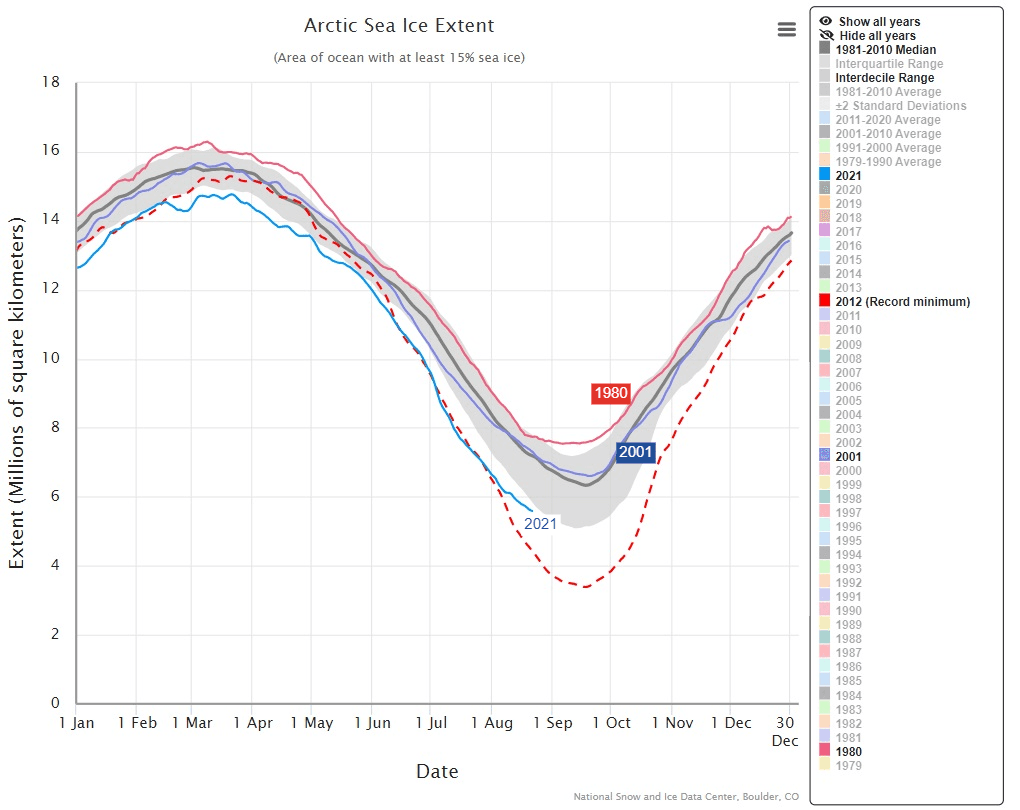 Ainsi, le minimum annuel, généralement atteint à la mi-septembre, devrait se situer autour des 5 millions de km², ce qui placerait l'année 2021 dans le top 10 des minimum les plus importants depuis le début des années 2000.