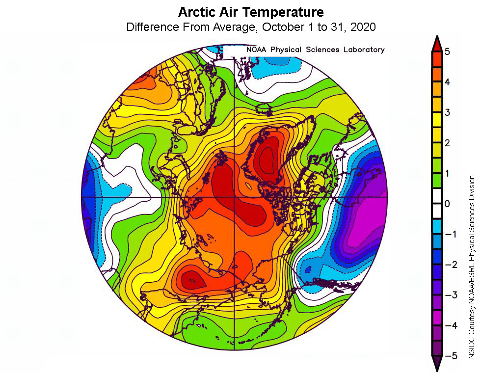Depuis cette date, si la glaciation a repris, l’étendue des glaces reste anormalement basse. Ceci a été particulièrement marquant au cours du mois d’octobre en raison de températures très (trop) élevées, avec une anomalie mensuelle de +4 à +5°C sur la côte Sibérienne, au nord du Groenland ainsi que sur l’Ouest de l’océan Arctique.