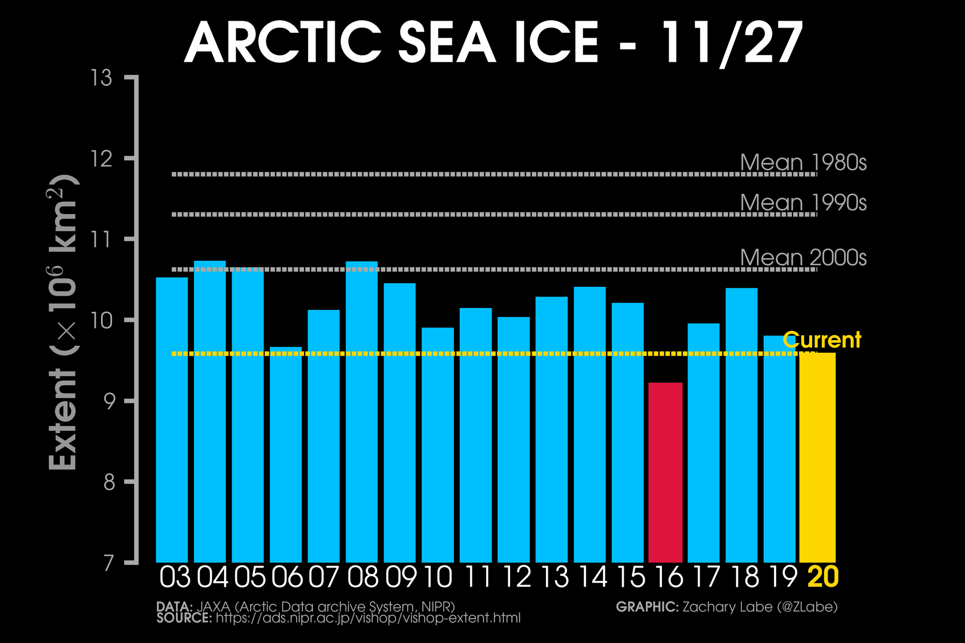 Étendue de la banquise Arctique au 27 novembre - comparatif depuis l'année 2003 - Zachary Labe