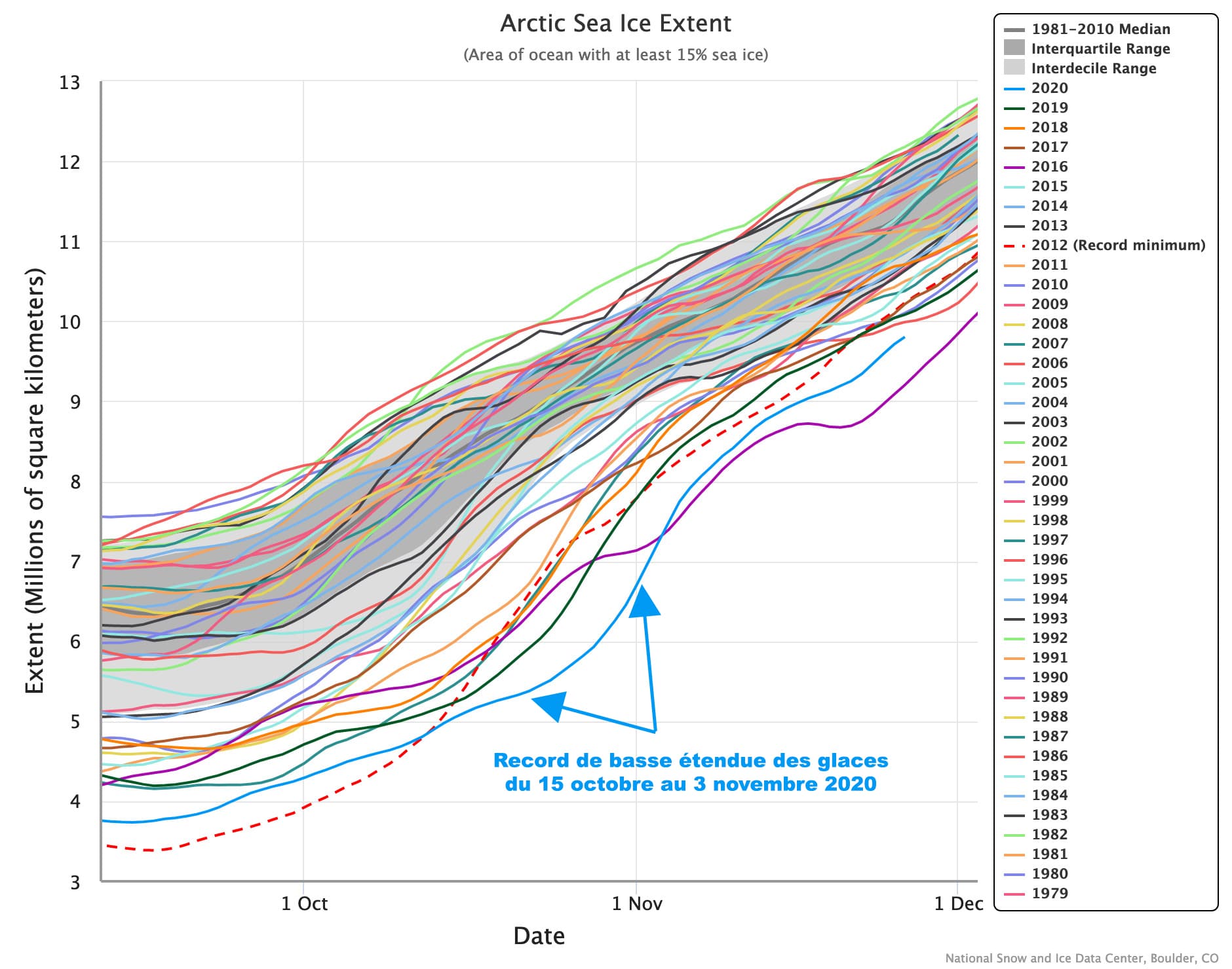 Étendue de la banquise Arctique en millions de km2 - période 1er septembre - 1er décembre depuis 1979 - NSIDC