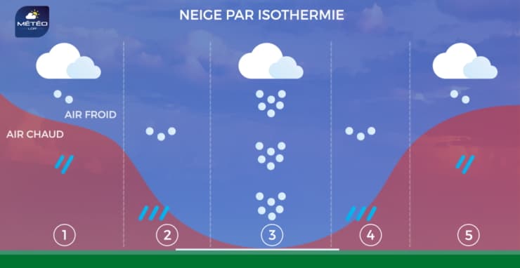 Avec le caractère stationnaire des précipitations et l'arrêt du vent de sud soutenu, la limite pluie/neige s'est abaissée jusqu'en plaine au pied des Alpes, sous l'effet d'isothermie. Ce phénomène se produit lorsque les précipitations sont actives et continues. Présents en nombre, les flocons en altitude entraînent l'air froid dans leur chute et causent un abaissement rapide de la limite pluie/neige. Une fois que les intensités faiblissent, l'apport en air froid n'est plus suffisant et la neige remonte en altitude.