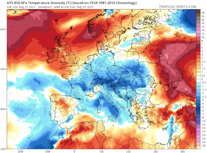 Anomalies thermiques à 850 hPa (vers 1500m) du mercredi 1er au jeudi 9 septembre 2021 - via wxcharts.com