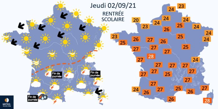 Ainsi, la journée du jeudi 2 septembre 2021 marquant la rentrée scolaire en France s'annonce plaisante. Les deux tiers nord profiteront d'un soleil généreux tandis que le ciel s'ennuagera dans le sud avec la menace de quelques averses orageuses (restant désorganisées). Les températures seront souvent comprises entre 24 et 28 degrés, apportant encore quelques sensations estivales pour cette rentrée 2021.