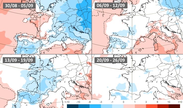 Selon le scénario du modèle européen, le début du mois de septembre 2021 serait classique avec le développement d'une instabilité orageuse par le sud-ouest. Les conditions instables prendraient l'avantage sur la plupart des régions en semaine du 6 au 12 septembre. Ces anomalies humides pourraient ensuite persister sur la moitié nord en seconde quinzaine du mois tandis qu'aucune anomalie ne se détache dans le sud.