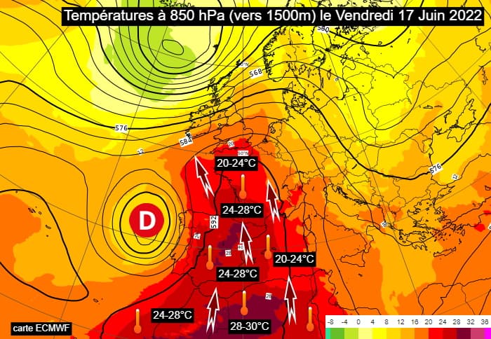 En cet été 2022, la France a presque constamment baigné dans les masses d'air très chaud. Pour simplifier, si la masse d'air atteint 15°C à 850 hPa (vers 1500m d'altitude), une vague de chaleur peut s'observer au sol avec des températures susceptibles d'atteindre les 35°C. Lorsque les 20°C sont atteints à 850 hPa, ce sont généralement des températures caniculaires que l'on retrouve nuit & jour. Sur l'ensemble des mois de juin et juillet 2022, on constate que la température moyenne à 850 hPa a dépassé les 15°C sur le tiers sud de la France, alors que ce seuil est normalement réservé à la partie sud de l'Espagne ! De même, l'isotherme des 20°C à 850 hPa s'est positionné sur le centre de l'Espagne au lieu du nord du Maghreb !