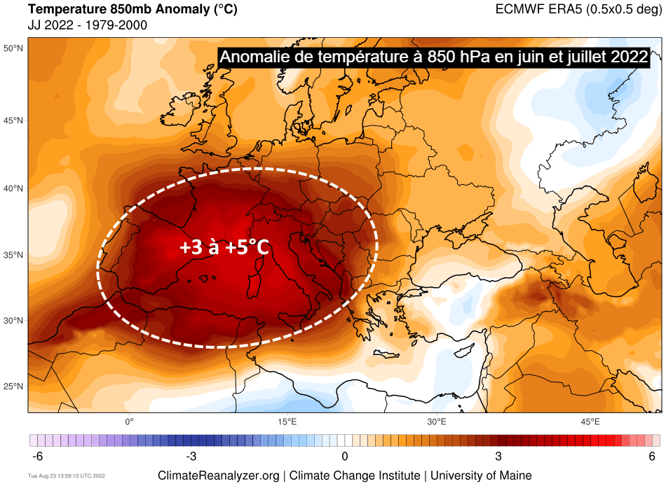 La carte ci-dessous montre l'anomalie des températures à 850 hPa durant les mois de juin et juillet 2022 par rapport à la fin du siècle dernier. On constate que le sud-ouest de l'Europe, France incluse, a connu une masse d'air en altitude plus chaude de 3 à 5°C par rapport à la normale ! Ainsi, le sud de la France a assisté à une majorité de journées propices à des vagues de chaleur sur une période longue de 2 mois, comme si subir des températures excessives sur de longues périodes devenait une normalité. D'ailleurs, certaines régions espagnoles ont subi des valeurs caniculaires durant presque tout l'été, preuve que cela pourrait à terme arriver chez nous...
