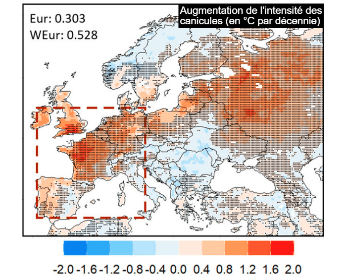 Récemment, une étude s'est penchée sur l'augmentation plus rapide des températures sur l'ouest de l'Europe que sur les autres régions de l'hémisphère situées aux mêmes latitudes. En effet, la proximité du Sahara permet aux masses d'air bouillant de remonter assez aisément jusqu'à nos régions. Cette étude concluait que l'intensité des vagues de chaleur allait augmenter d'environ 0,3°C par décennie sur l'ensemble de l'Europe mais de plus de 0,5°C par décennie en ne tenant compte que de sa partie ouest. D'ailleurs, une large partie nord-ouest de la France et le sud de l'Angleterre sont les zones les plus surexposées, susceptibles de voir l'intensité des canicules s'intensifier de plus d'un degré par décennie ! À ce rythme, nous devrions aller toujours plus haut dans les records...