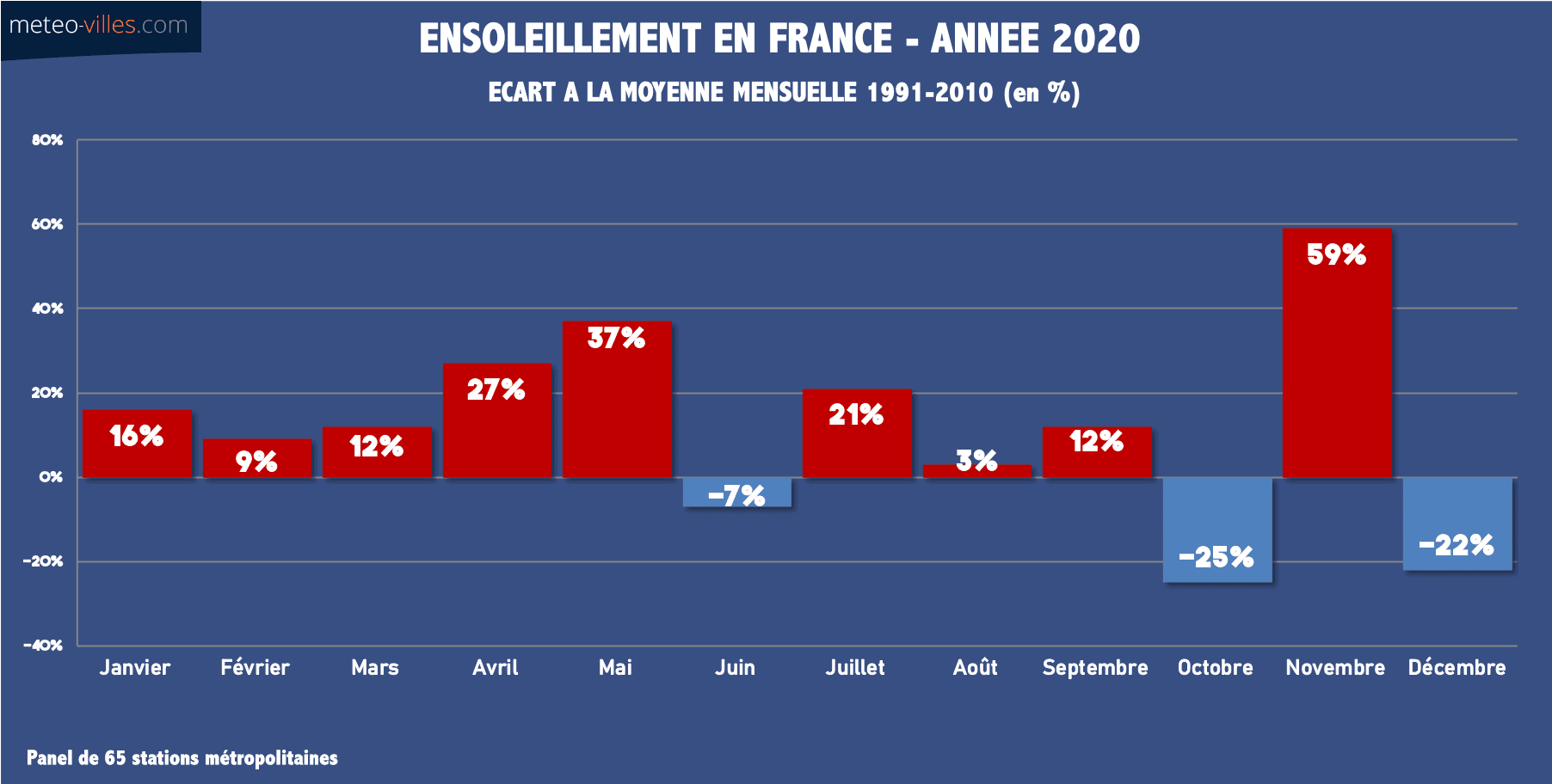 Même si nous n'avons pas pu en profiter pleinement en raison des mesures sanitaires de confinement, cette année 2020 a également été assez ensoleillée, terminant sur un bilan national de +12% sur notre panel de stations.. Seulement 3 des 12 mois de l'année ont présenté un déficit d'ensoleillement : il s'agissait des mois de juin (-7%), octobre (-25%) mais aussi du récent mois de décembre écoulé (-22%).