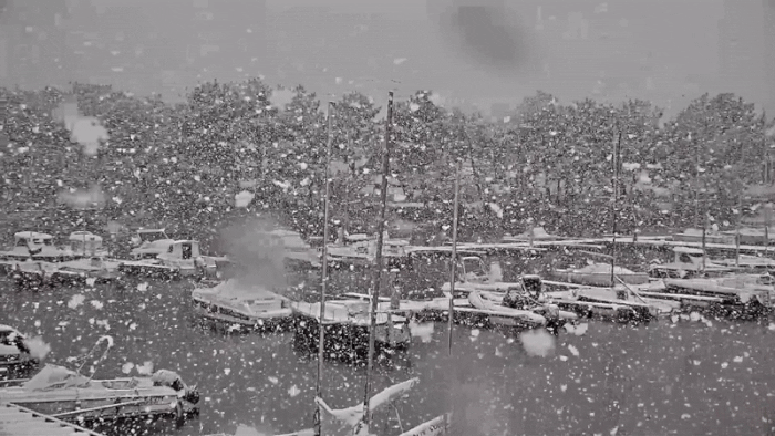 En début d'après-midi du mercredi 18 janvier 2023, une zone de précipitations venue de l'océan s'est enfoncée sur l'Aquitaine. Les fortes pluies ont généré un important effet d'isothermie avec des températures ayant perdu 4 à 5°C en quelques dizaines de minutes pour venir se situer près du zéro en Gironde. Ainsi, d'intenses chutes de neige se sont mises à tomber de Bordeaux jusqu'aux plages ! Ci-dessous, d'énormes flocons blanchissant le port d'Hourtin sur le rivage girondin en début d'après-midi.