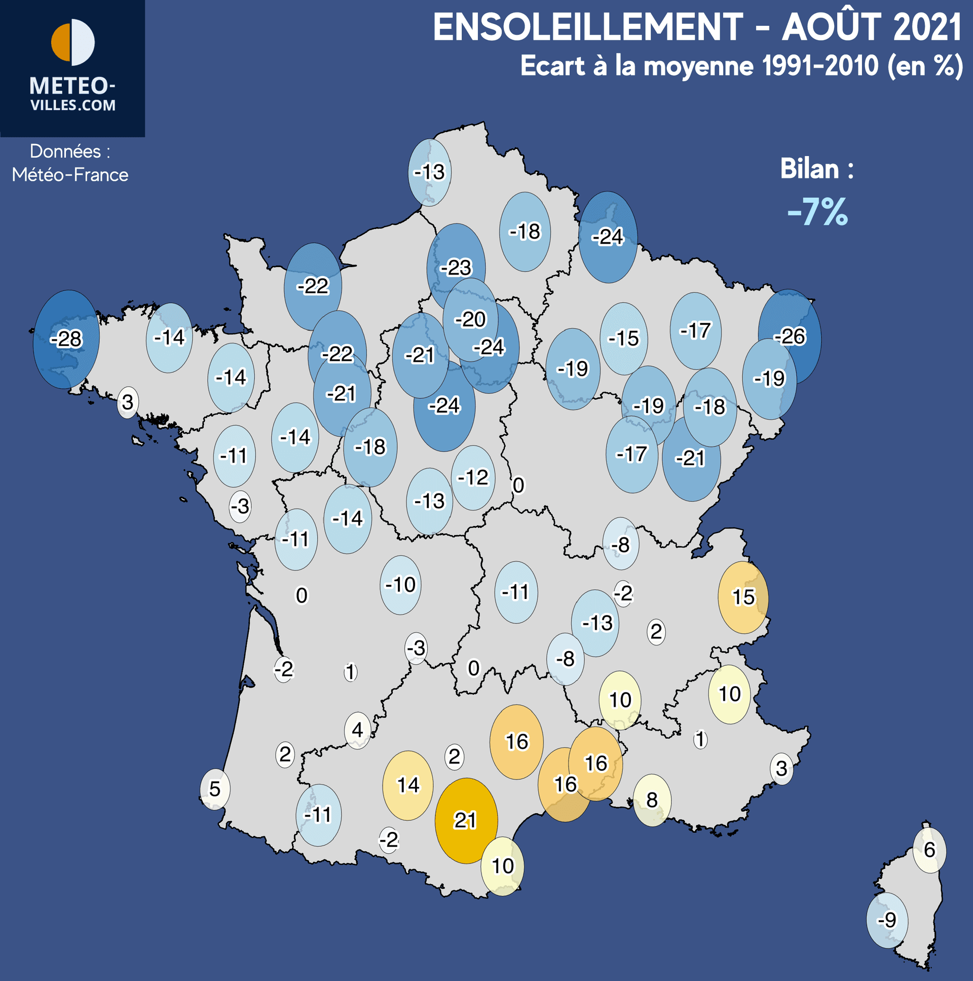 Après une première décade du mois humide, la grisaille était au rendez-vous. Mais malgré le retour des hautes pressions le reste du mois, le soleil n'a pas réussi à se manifester de façon durable en raison d'un flux dominant de Nord-Ouest, très mou, et porteur de nuages compacts sur un bon nombre de régions (>>). Au final, sur notre panel, le déficit d'ensoleillement à atteint -7% à l'échelle nationale au cours de ce mois d'août 2021.