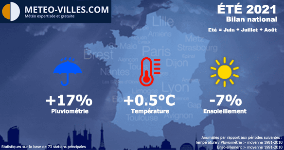 Si le bilan peu paraître étonnant niveau température, il ne l'est pas quant aux précipitations. En effet, le constat est implacable : cet été météorologique 2021 a été bien humide, puisque le bilan sur notre panel de stations montre un excédent de +17% à l'échelle nationale.