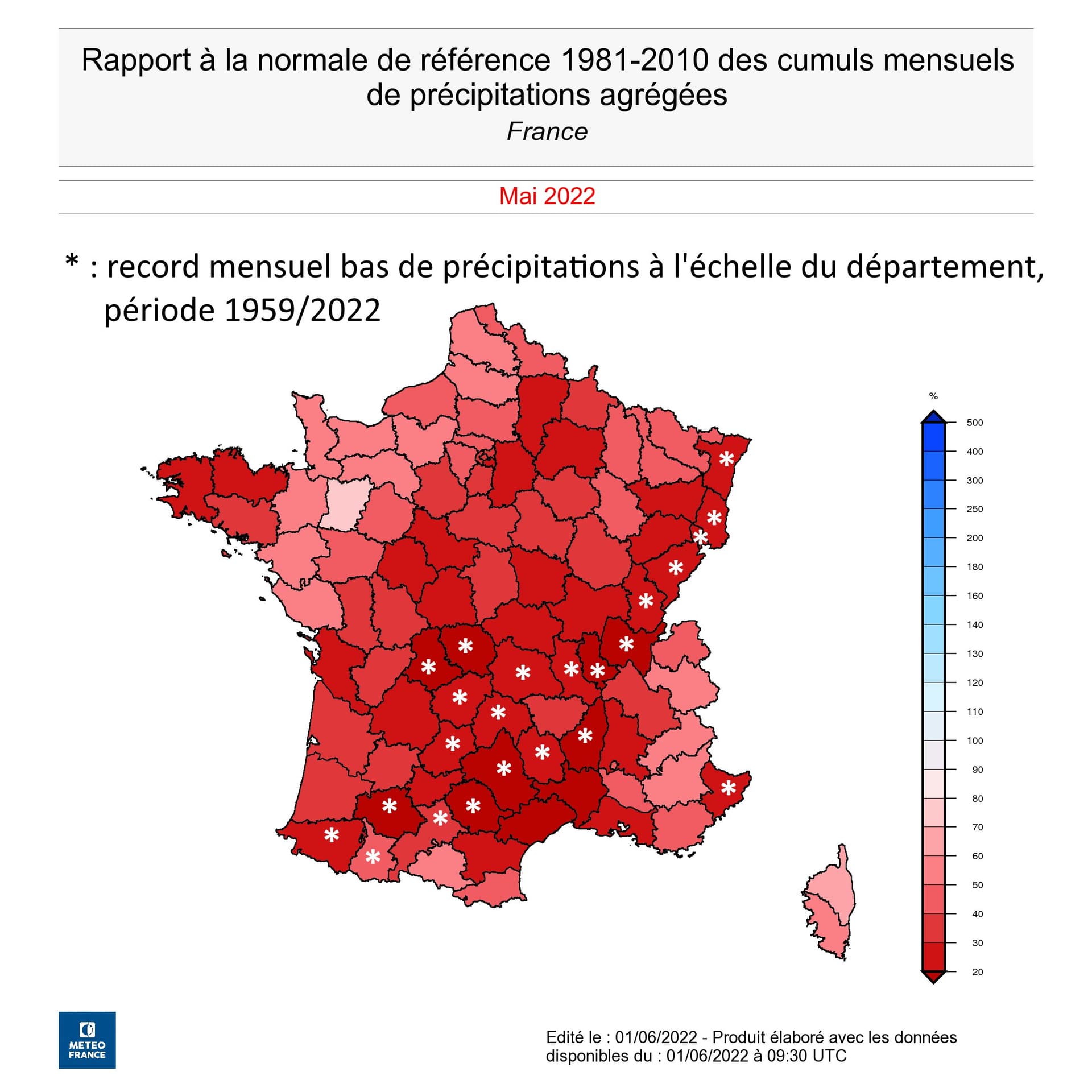 Un bilan terriblement bas traduit en termes de cumul, avec seulement 29.3mm en moyenne à l'échelle du pays (environ 35mm pour l'ancien record de mai 1989).