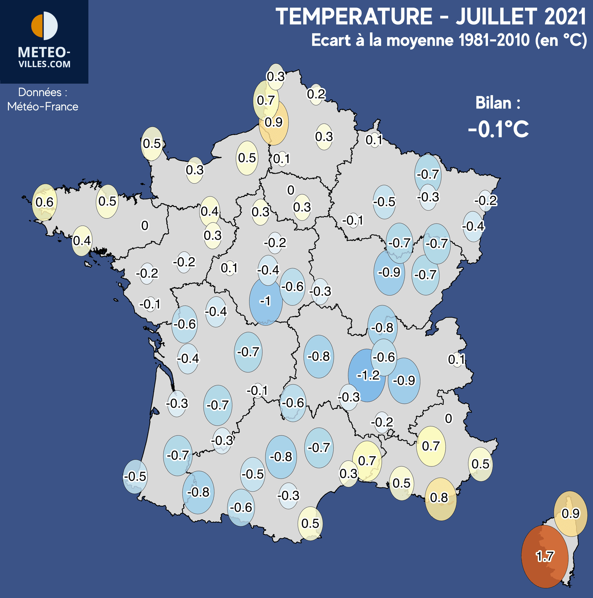 Néanmoins, cette valeur est compensée à l'échelle du pays par le temps très estival ayant perduré sur les régions méditerranéennes, à l'écart de l'agitation durant une large partie du mois. Ajaccio a par exemple connu un mois de juillet très chaud, dépassant de 1,7°C les normales, le record absolu de chaleur a même été approché le 23 juillet sur cette commune avec 40,1°C (à 0,2°C du record absolu de la station).