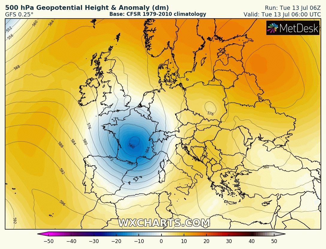 Cette tendance perturbée s'est prolongée durant le mois de juillet en raison de conditions n'évoluant que très peu en altitude. Alors que l'Est et le Sud de l'Europe subissait des températures caniculaires durables, l'Ouest du continent et la France restaient soumis à l'influence des gouttes froides.