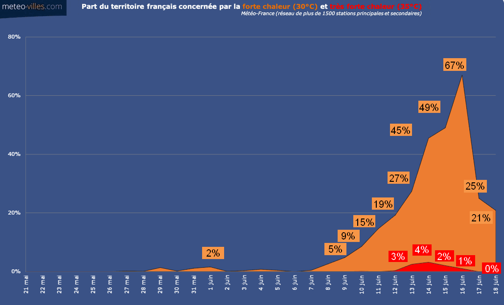 Part du territoire français concerné par la forte chaleur et les très fortes chaleurs - Météo-Villes