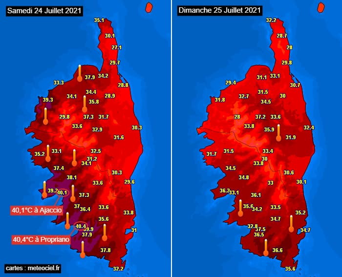 Températures maximales relevées en Corse les samedi 24 et dimanche 25 juillet 2021 - via meteociel.fr