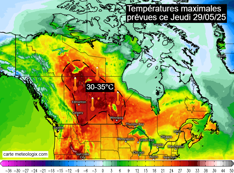 Comme on le voit sur la carte ci-dessous, le pic de chaleur sera atteint ce jeudi 29 mai 2025 au Canada. Ce sont les provinces du Manitoba, du Saskatchewan, de l'Alberta et même du sud des Territoires du Nord-Ouest qui vont subir les températures les plus élevées, souvent comprises entre 30 et 35°C ! Les Territoires du Nord-Ouest, dont la latitude est supérieure à 60°N, risquent fort de battre leur record pour un mois de mai. Des modélisations envisagent 34°C dans le sud de la province, à une latitude semblable à celle d'Helsinki en Finlande !