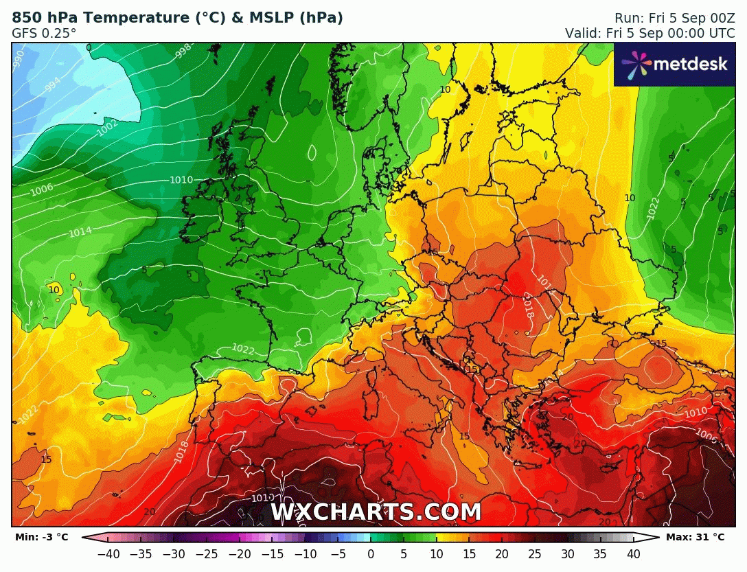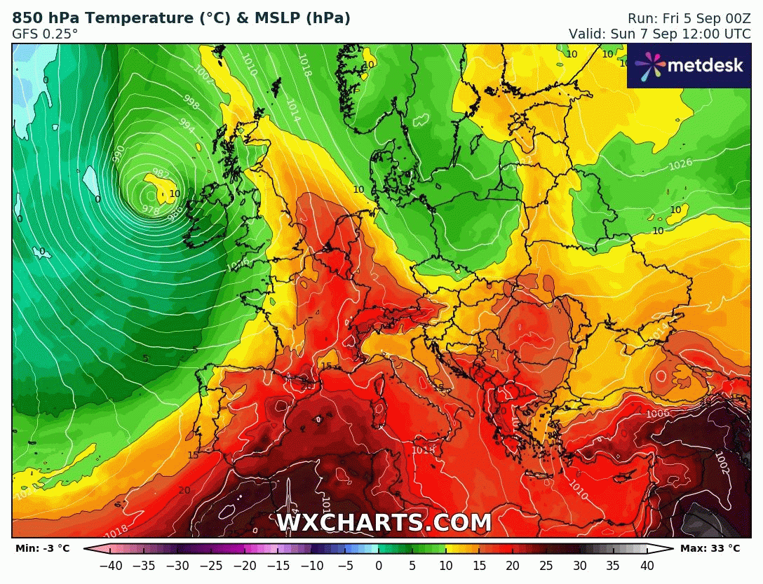 Animation des températures à 850 hPa sur l'Europe du 5 au 9 septembre 2025 – Modèle GFS via WX CHARTS