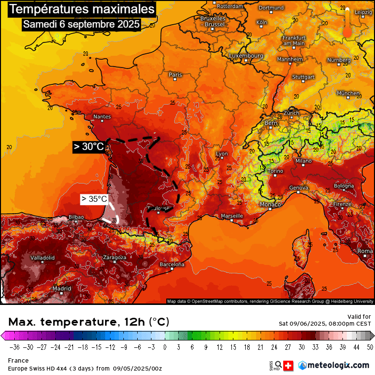 Températures maximales envisagées pour le samedi 6 septembre 2025 – Modèle SWISS HD 4x4 via meteologix