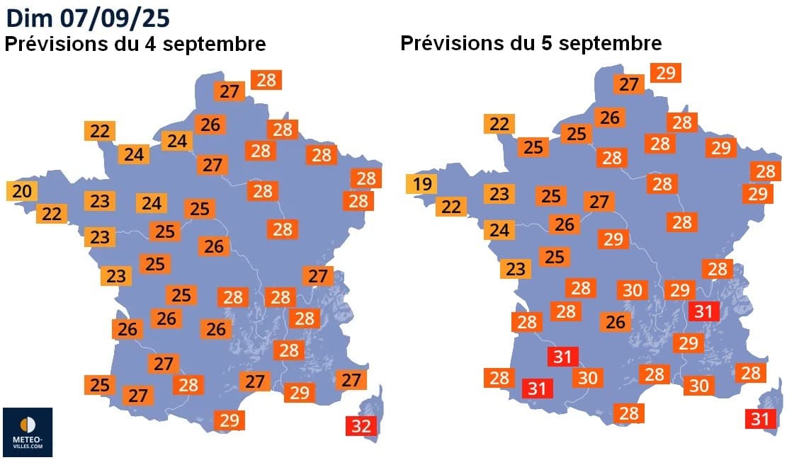 Comparaison des maximales prévues sur la France pour la journée du dimanche 7 septembre 2025 – Météo-Villes