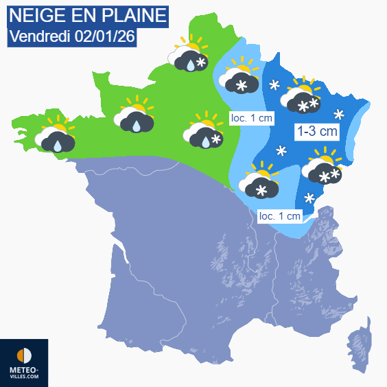 Ainsi, le petit front qui va se former au dessus de la Mer du Nord va ensuite gagner le nord de la France et la Belgique avant de toucher le quart nord-est de l'hexagone, s'enfonçant jusqu'au Jura dans la nuit du vendredi 2 au samedi 3 janvier. En présence de la masse d'air froid que nous venons d'évoquer, les précipitations seront essentiellement neigeuses sur le Grand-Est et la Bourgogne-Franche-Comté. Une couche de 1 à 3 cm pourra se former, notamment des Ardennes au Jura, avec une tenue jusqu'en plaine, bien que plus aisée dès les premières hauteurs.