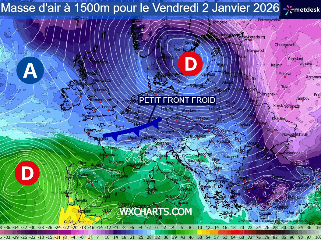 Une vaste dépression hivernale positionnée sur la Mer Baltique enverrait un nouvel afflux d'air froid sur le nord-est de la France ce vendredi 2 janvier 2026. Les températures à 850 hPa (vers 1500 mètres d'altitude) seront proches de -5 à -6°C vers le Grand-Est puis la Bourgogne-Franche-Comté, des niveaux suffisamment bas pour autoriser de la neige jusqu'aux plus basses altitudes. De plus, un petit front froid devrait se former au dessus de la Mer du Nord puis circuler sur le nord-est de l'hexagone.