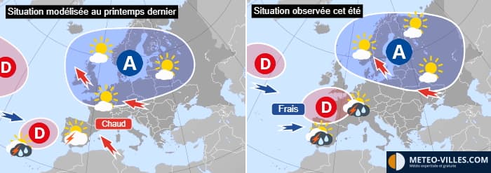 Si les tendances saisonnières avaient bien mis en évidence la mise en place de ce blocage anticyclonique au printemps dernier, ce dernier s'est finalement positionné un peu plus à l'est qu'initialement envisagé. Si cela n'a pas changé grand chose pour le nord et l'est du continent, ce décalage entre la prévision et la réalité a véritablement tout changé pour l'ouest de l'Europe, dont la France.