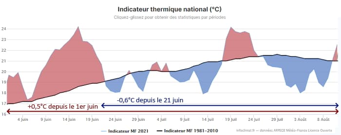 Si l'on ne tient pas compte des deux premières décades du mois de juin 2021 et que l'on calcule l'anomalie provisoire de l'été calendaire sur la période allant du 21 juin au 11 août 2021, la température moyenne en France tombe à 20,07°C, soit une valeur environ 0,6°C inférieure aux normales. Cela fait toute la différence. On peut donc bel et bien dire que le temps est plus frais que la normale sur la période des vacances scolaires.