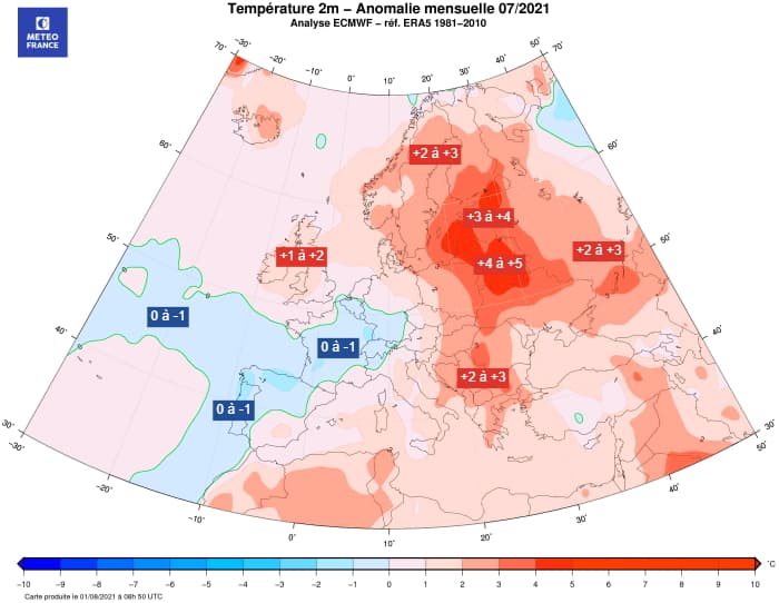 Anomalies thermiques en Europe au cours du mois de juillet 2021 - via Météo France