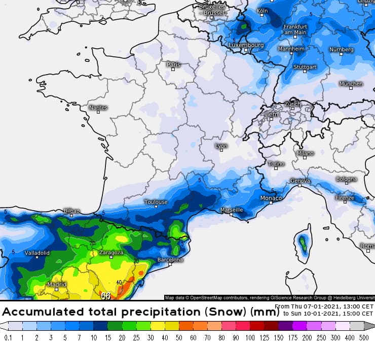 Il est important de préciser que la localisation précise de cette dépression reste à affiner et que le zonage de ces risques neigeux et les quantités associées nécessiteront des ajustements dans les prochaines heures. Le scénario du modèle européen ci-dessus l'illustre parfaitement avec une neige remontant davantage sur le Languedoc-Roussillon et jusqu'à Toulouse où quelques centimètres seraient possibles.