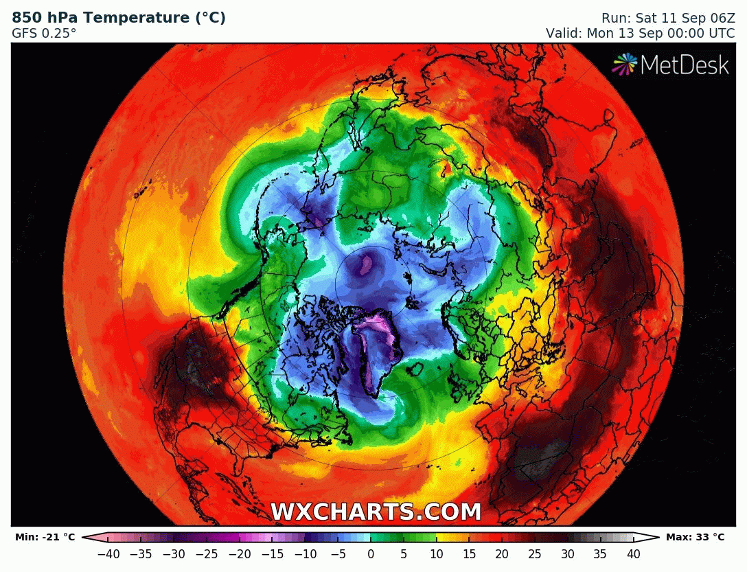Évolution des températures à 850 hPa sur l'hémisphère Nord jusqu'au dimanche 19 septembre 2021 – Modèle GFS via WX CHARTS