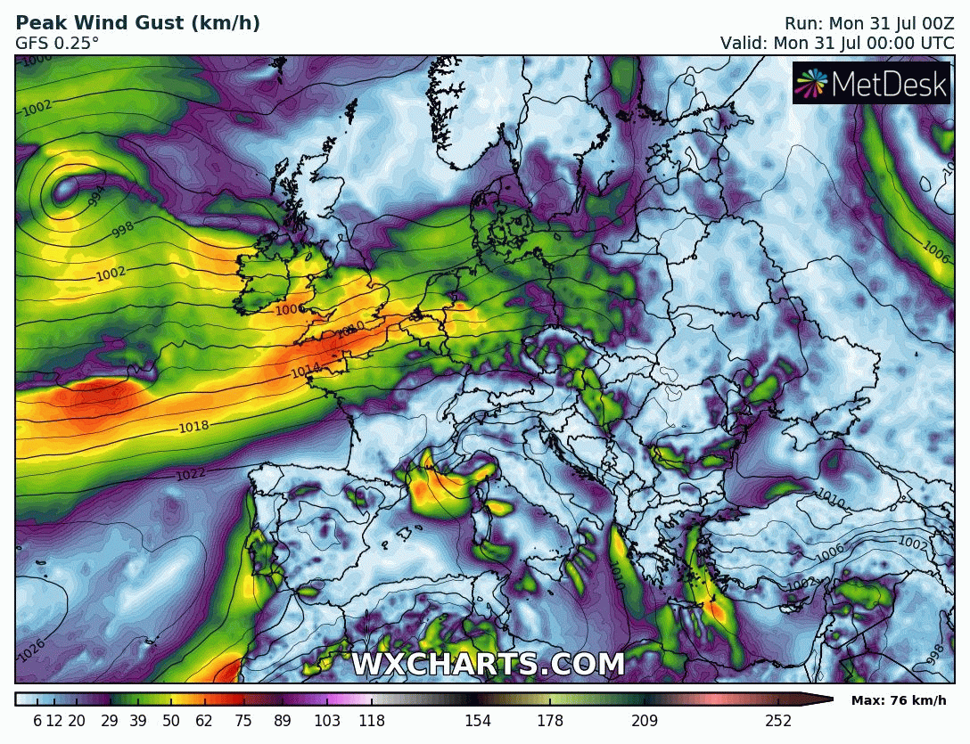 Animation des rafales de vent sur l'Ouest de l'Europe entre le 31 juillet et le 3 août 2023 – Modèle GFS via WX CHARTS