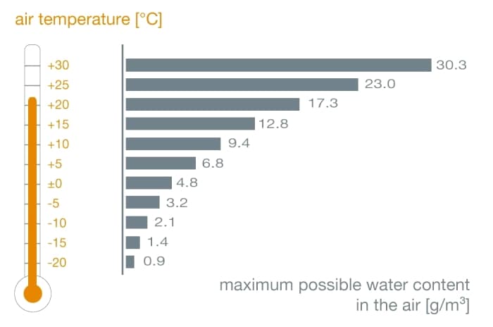 Contenance maximale en vapeur d'eau dans l'atmosphère en fonction de la température - via testo.com